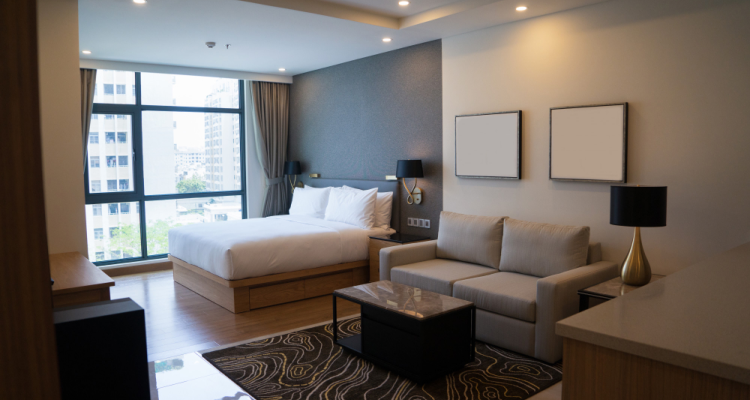 The room is decorated in a modern style with neutral colors. The bed is made with luxurious bedding and the desk has plenty of space to spread out work materials. The high-speed internet access is perfect for staying connected with clients or colleagues. The microwave and fridge are convenient for storing snacks and drinks. The 37-inch TV provides entertainment options and the Keurig coffee maker is a great way to start the day.